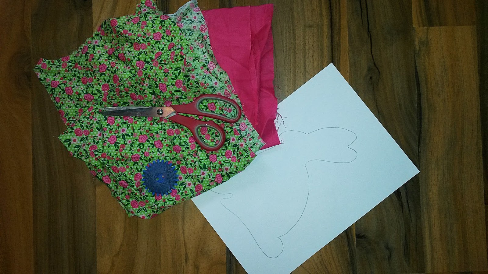 Zuerst wird die Schablone ausgeschnitten und falschrum auf die linke Seite des Stoffes gelegt, sodass bei bedruckten Stoffen die Bleistiftlinien später nicht mehr zu sehen sind. Bei Stoffen, die auf beiden Seiten gleich aussehen ist das natürlich Schnuppe.