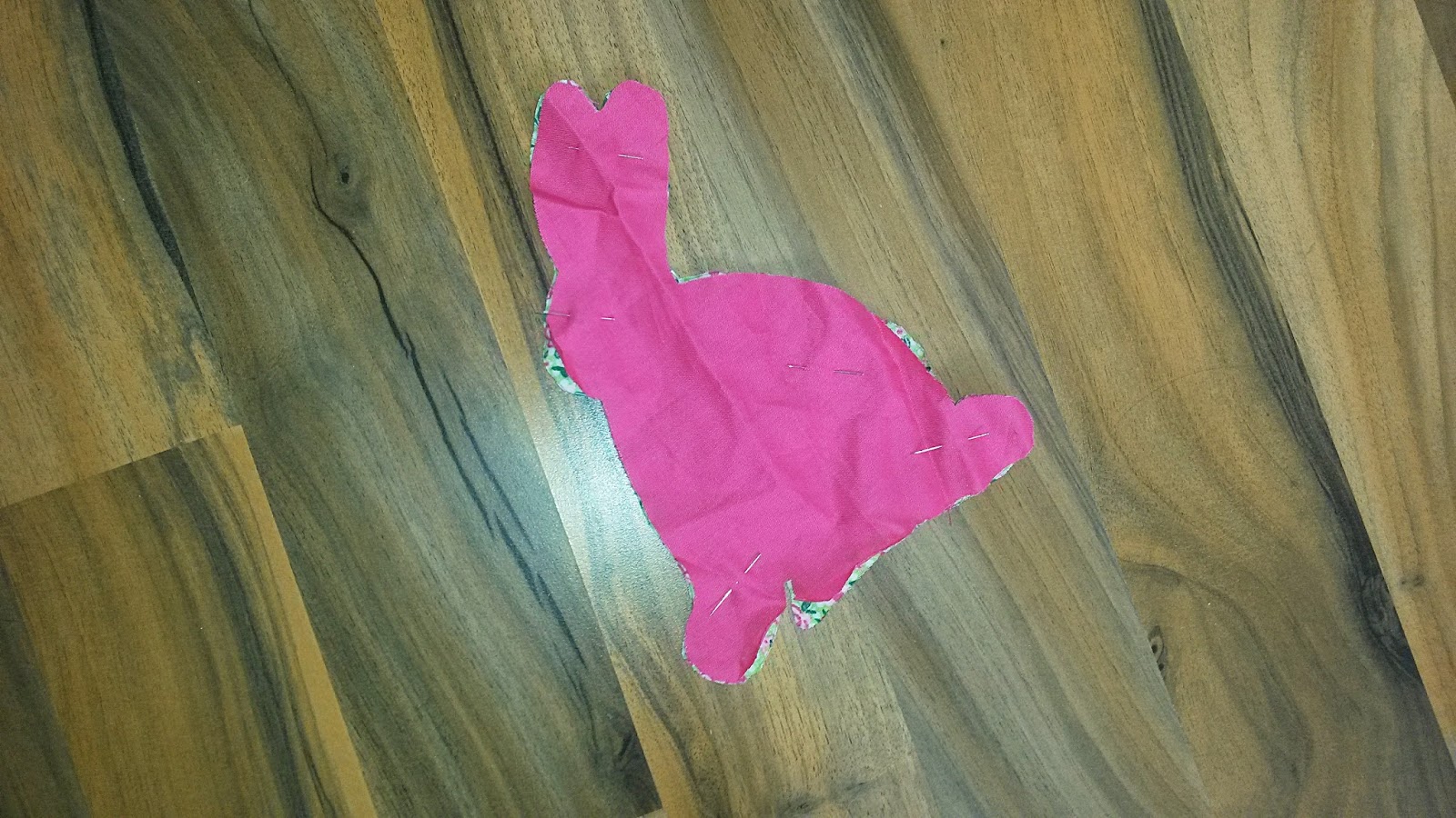 Nun werden die beiden Außenseiten, also bei dem bedruckten Stoff das Muster außen, aufeinandergelegt und mit Stecknadeln fixiert. Achtet hierbei darauf, dass die Ohren wirklich übereinander liegen und sich auch sonst nichts verzieht.