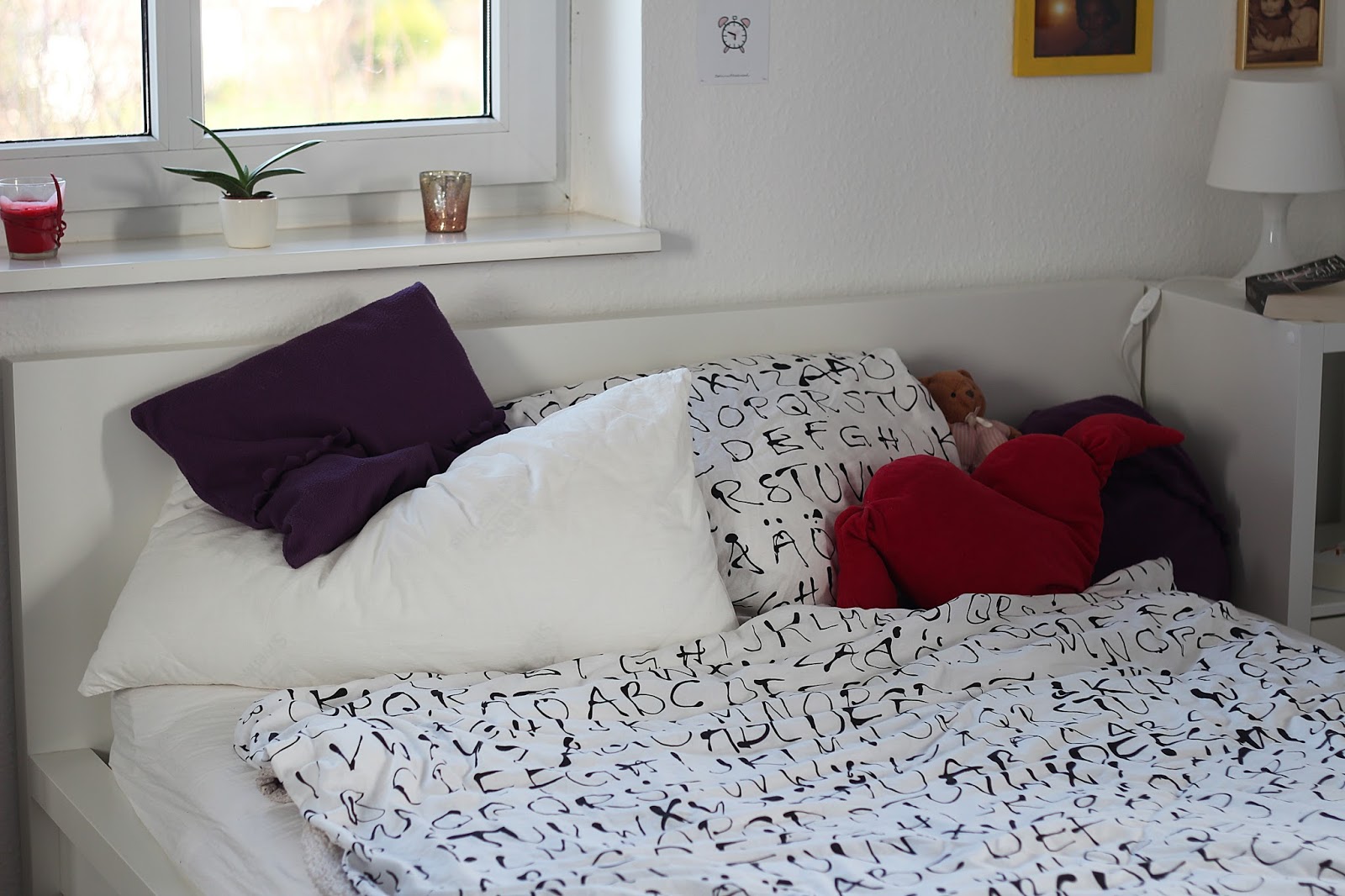 Zuerst möchte ich euch gerne mein Zimmer zeigen, das ist mein kleiner Rückzugsort, an dem ich meine Blogposts schreibe, vor dem PC über Hausarbeiten brüte, meinen Kleiderschrank viel zu oft nach tollen Sachen durchsuche und und und… Eigentlich ist mein Zimmer ziemlich langweilig, alles ist in weiß gehalten und von Ikea. Abgesehen vom meinem Schrank, sonst ist selbst die Bettwäsche auf den Fotos dort gekauft 😀 Aber so passt wenigstens alles zusammen und ich liebe momentan weiße Möbel, weshalb andere Farben auch gar nicht in Frage kommen. Dekotechnisch hab ich gar nicht sooo viel gemacht, abgesehen von den Bilderrahmen sind sogar alle Dekosachen noch von früher. Hört sich in dem Zusammenhang irgendwie komisch an 😀