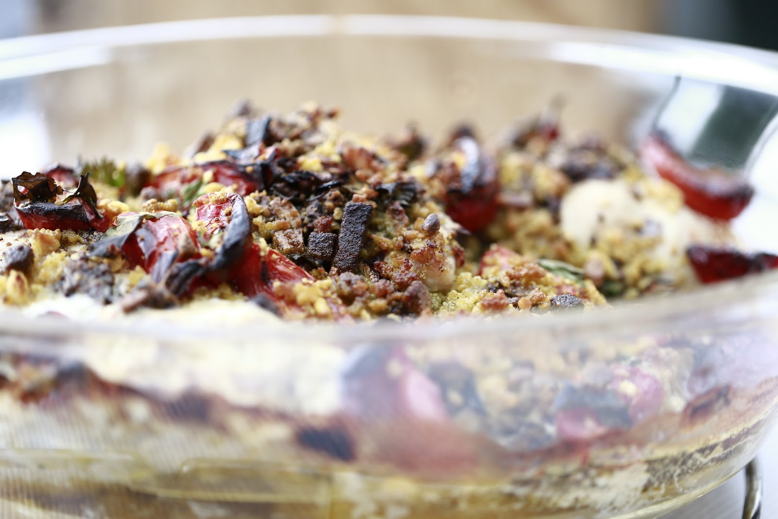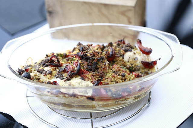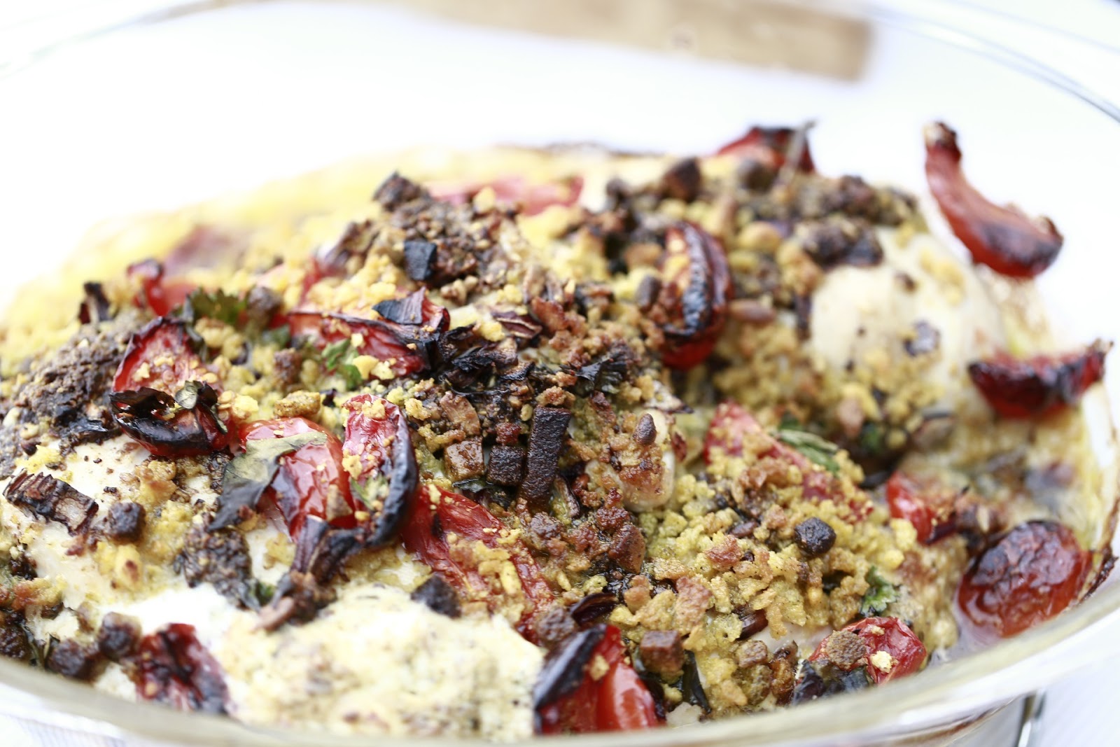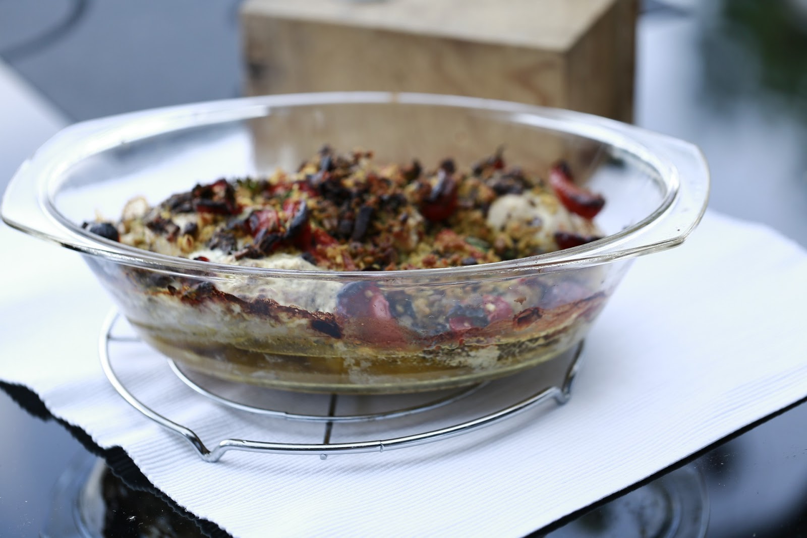5. Sind die Taschen befüllt solltet ihr sie wieder zuklappen und in eine Auflaufform legen. Nun könnt ihr sie mit dem restlichen Pesto bestreichen und mit den Croutons bedecken, die Tomaten werden anschließend auf die Croutons gelegt.