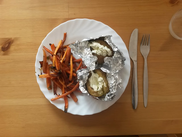Zu den Kartoffeln hab ich ganz einfachen Kräuterfrischkäse gegessen, wir hatten leider keine Sour Creme, die ja eigentlich sehr viel passender wäre, aber geschmacklich tut sich da nur wenig.