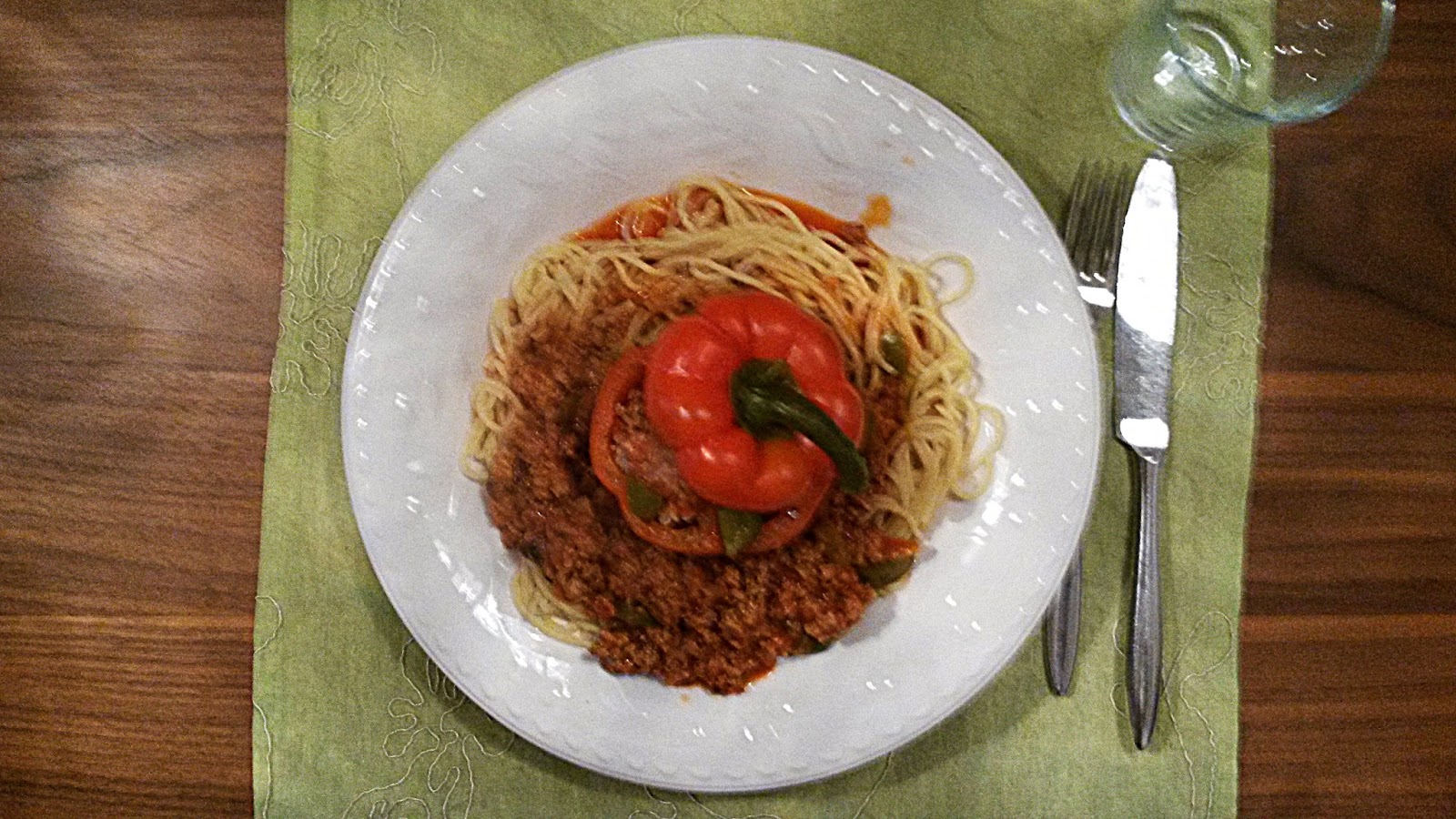 - Das übrig gebliebene Hackfleisch in Olivenöl krümelig braten und in einen großen Topf füllen, in diesen ebenfalls die gehakte Zwiebel und Paprika geben. Nach kurzer Kochzeit Tomatenmark, Gemüsebrühe und Tomaten hinzugeben und etwas köcheln lassen.