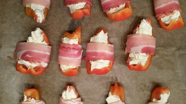 3. Die Creme auf die Paprikastückchen geben und mit Bacon ummanteln.