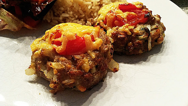 3. Als nächstes etwa neun Hackbällchen auf ein Backblech setzen und Kuhlen einarbeiten, die vorher kleingehackten Tomaten/- Paprikastücke in die Kuhlen geben.