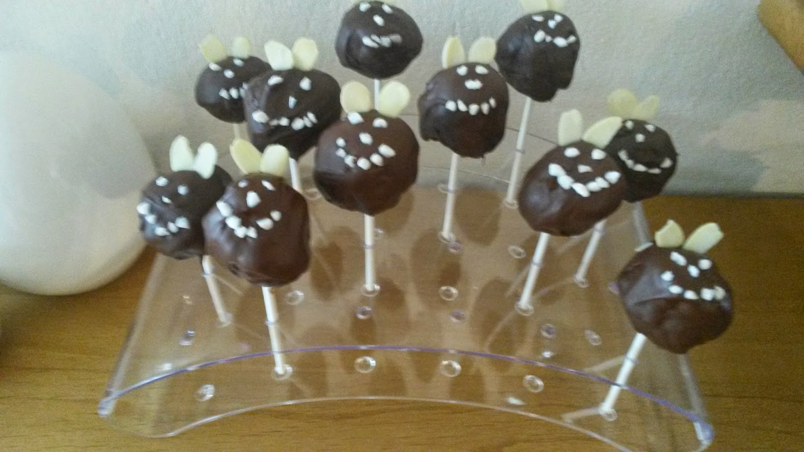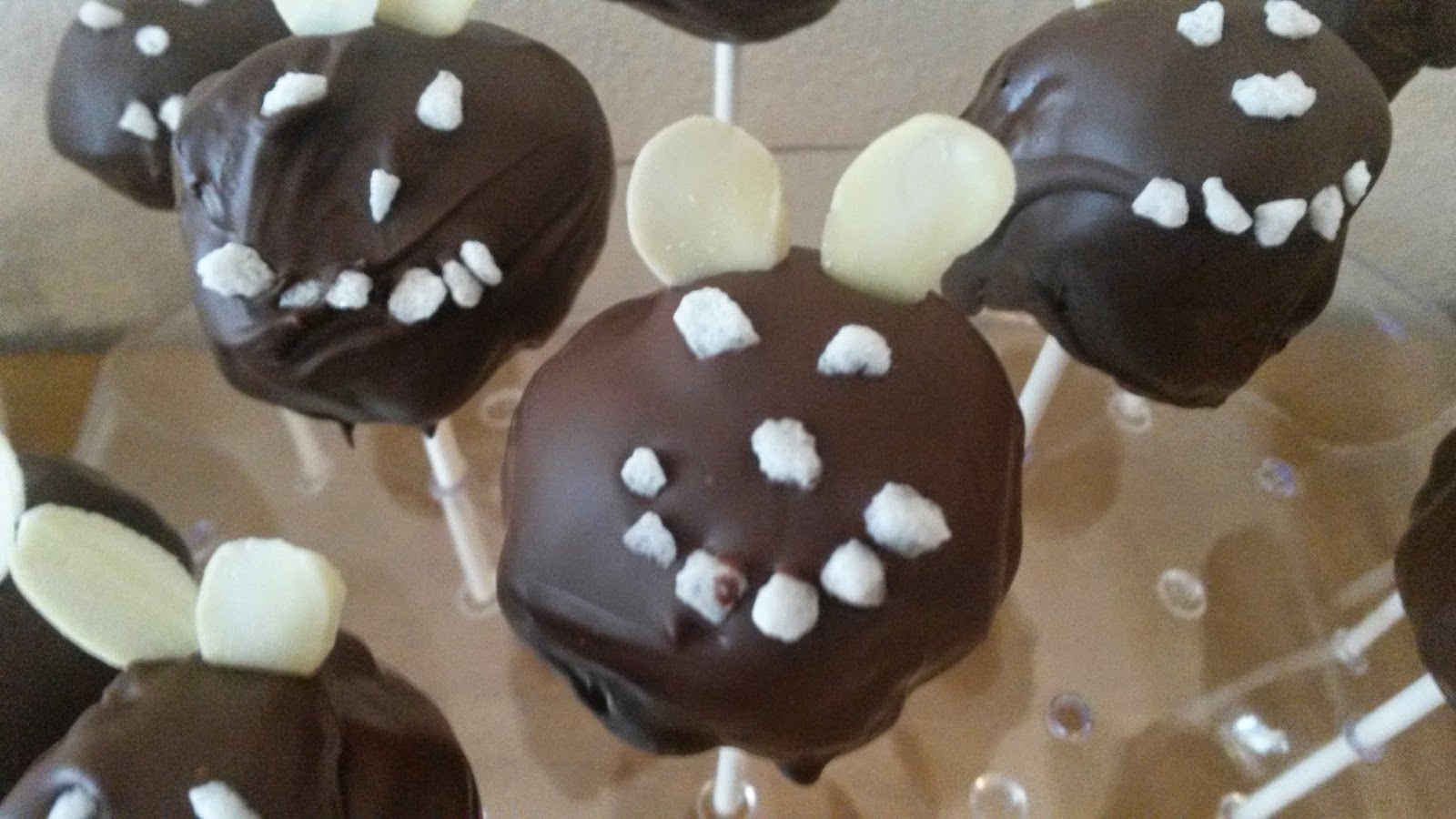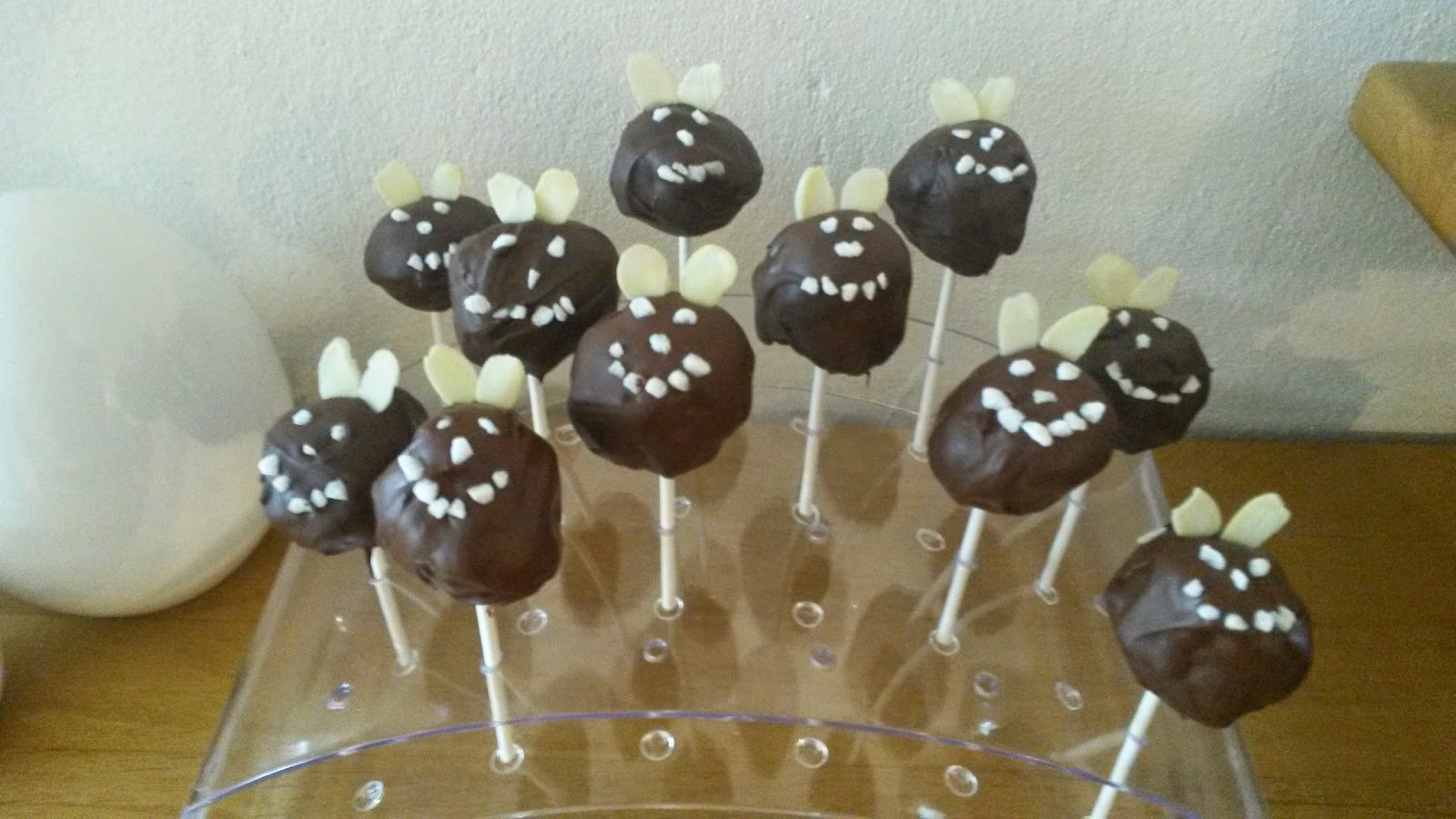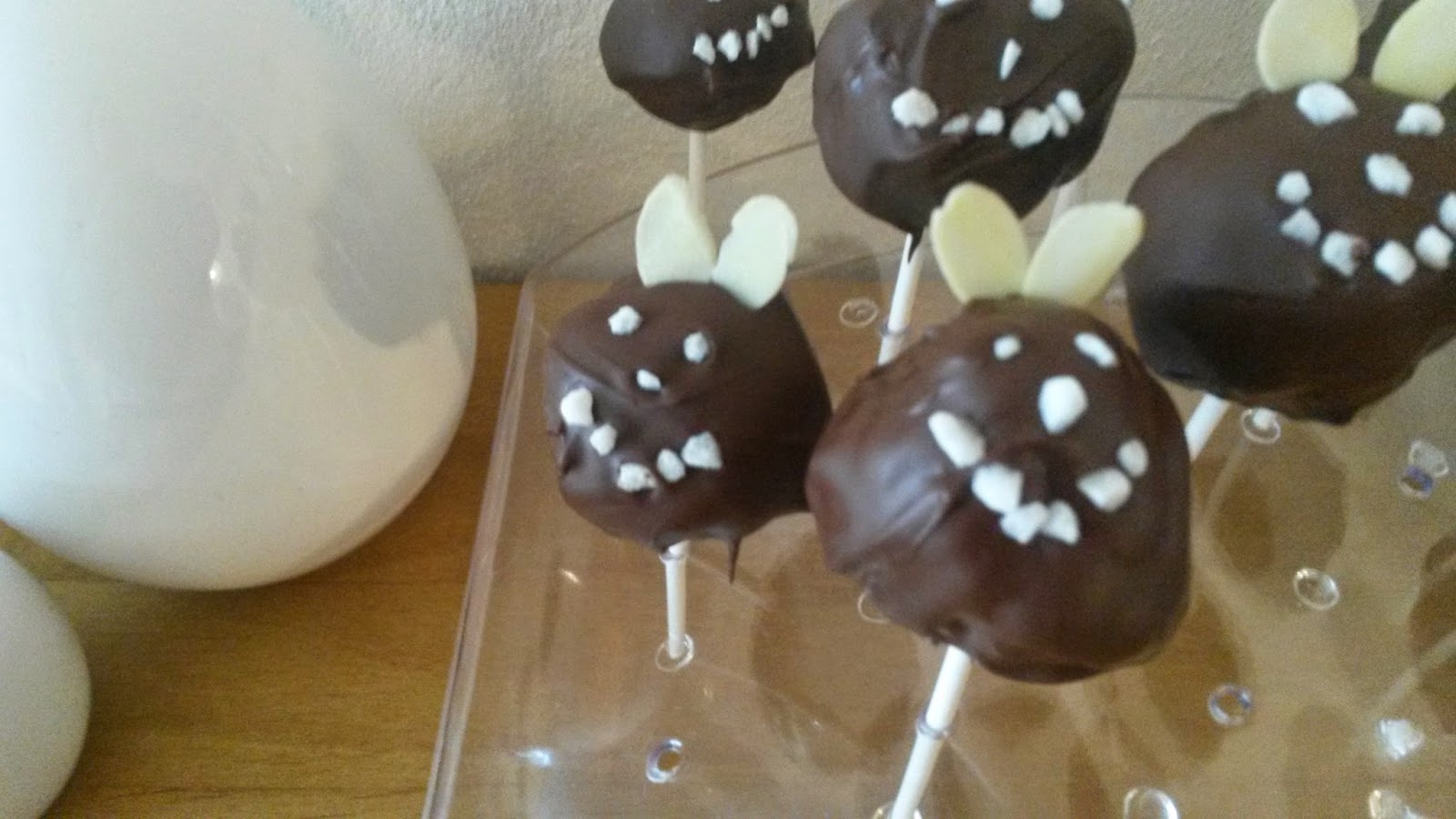 - Die Masse zu kleinen Kugeln formen, jeweils einen Stiel in die Glasur tauchen und dann in die Cake Pop Kugel stecken, so hält es besser. Dann den kompletten Pop in die Glasur tauchen, überschüssige schokolade entfernen und am besten sofort verzieren, dazu habe ich zwei Mandelsplitter als Ohren oben hinein gesteckt und den Hagelzucker so drappiert, dass es wie ein Gesicht aussieht.